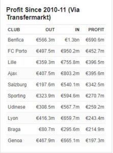 Kwa mujibu wa Transfermarket, hii ni orodha ya timu ambazo zimepata mafanikio makubwa kwa kupata faida kwenye biashara ya wachezaji katika soko la uhamisho katika kipindi cha miaka 12 iliyopita.